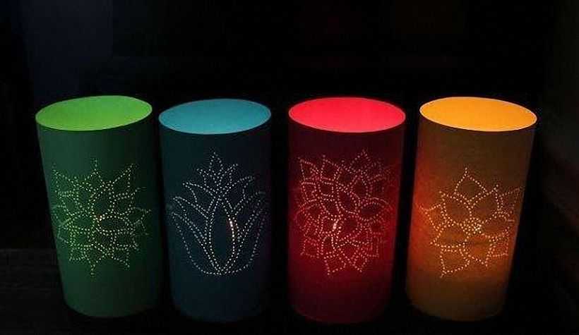 Этот вариант изделия прост в исполнении, но требует большой аккуратности и усидчивости. Бумага — приятный материал для рукоделия. Из него можно сделать красивый ночник. Для работы понадобится плотная бумага, канцелярский нож или шило, и любой предмет, излучающий свет. Нужно всего лишь создать аккуратные отверстия в виде какого-то рисунка и свернуть бумагу в цилиндр, внутрь поместив «свет».