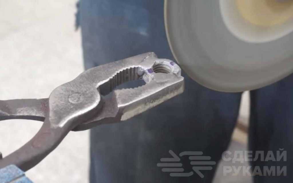 После сварки необходимо будет зачистить сварные швы, а потом с помощью болгарки разрезать гайку пополам. Для удобства плоскогубцы лучше зажать в тисках.