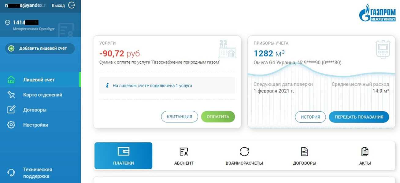 Вход в личный кабинет «Газпром межрегионгаз» осуществляется путем ввода логина — электронная почта или мобильного телефона, указанного при регистрации и пароля. После авторизации пользователь перенаправляется на главную страницу, где непосредственно представлена вся необходимая информация, а также функции лк.