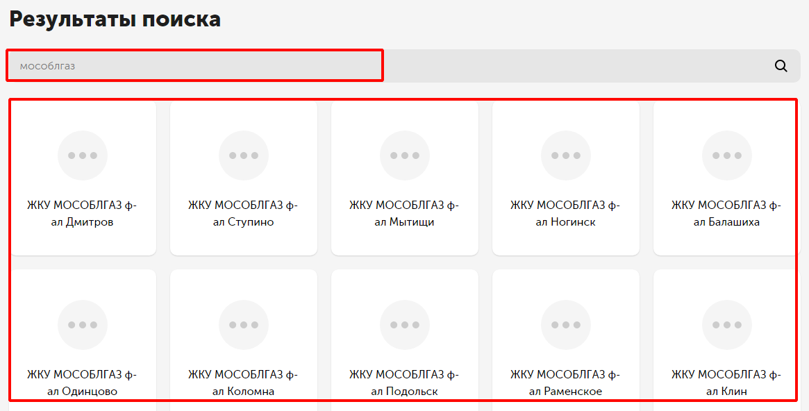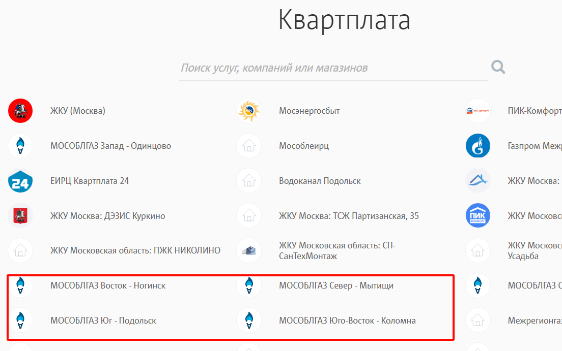 На открывшейся странице в верхней строке напишите “Мособлгаз”, чтобы быстро осуществить поиск. Появятся все филиалы компании, среди которых Вам нужно найти свой.