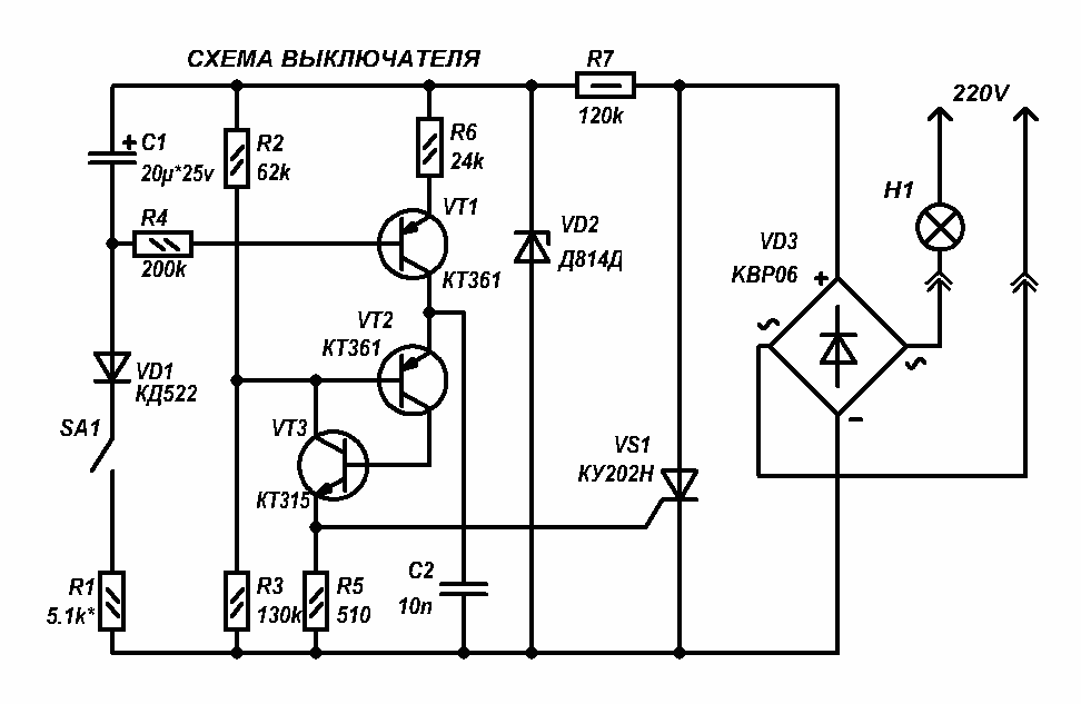 Достоинством схемы является ещё и то, что она подсоединяется вместо штатного выключателя или пакетника, нет дефицитных деталей, и для управления лампой (лампами), можно использовать низкоточные малогабаритные выключатели.
