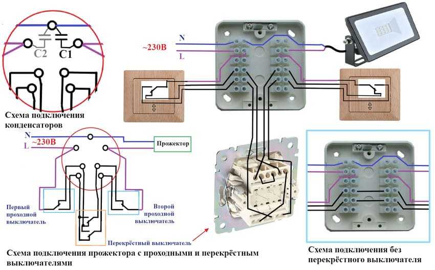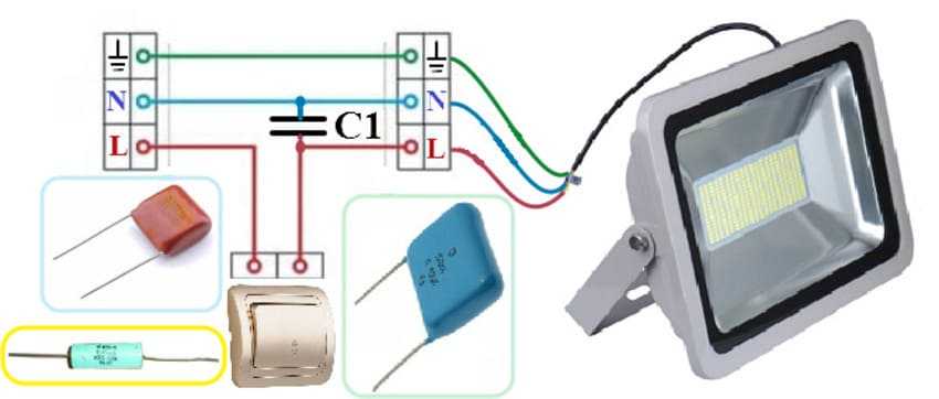 Картинка 8. Подключение конденсатора к схеме включения прожектора