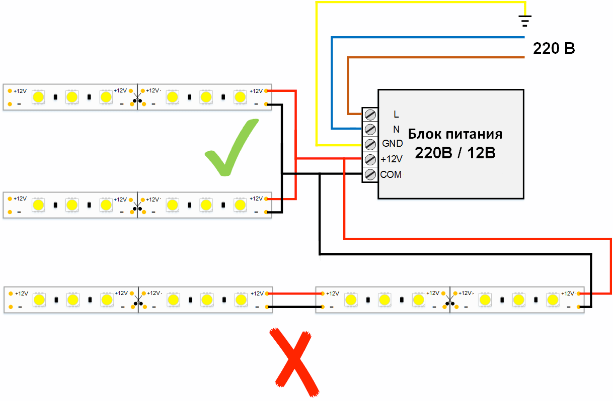 - При необходимости использовать несколько лент их подключают к блоку питания параллельно.
