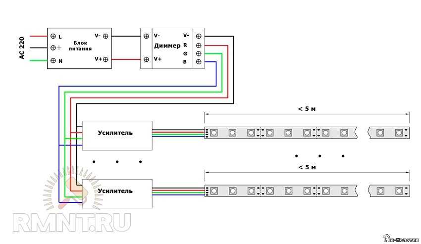 Несоклько светодиодных лент, включенные с использованием диммера или ШИМ-контроллера, должны подключаться с помощью усилителя