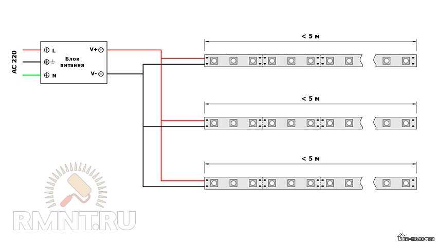 Схема прямого подключения светодиодной ленты. Несоклько лент подключаются параллельно к одному источнику тока