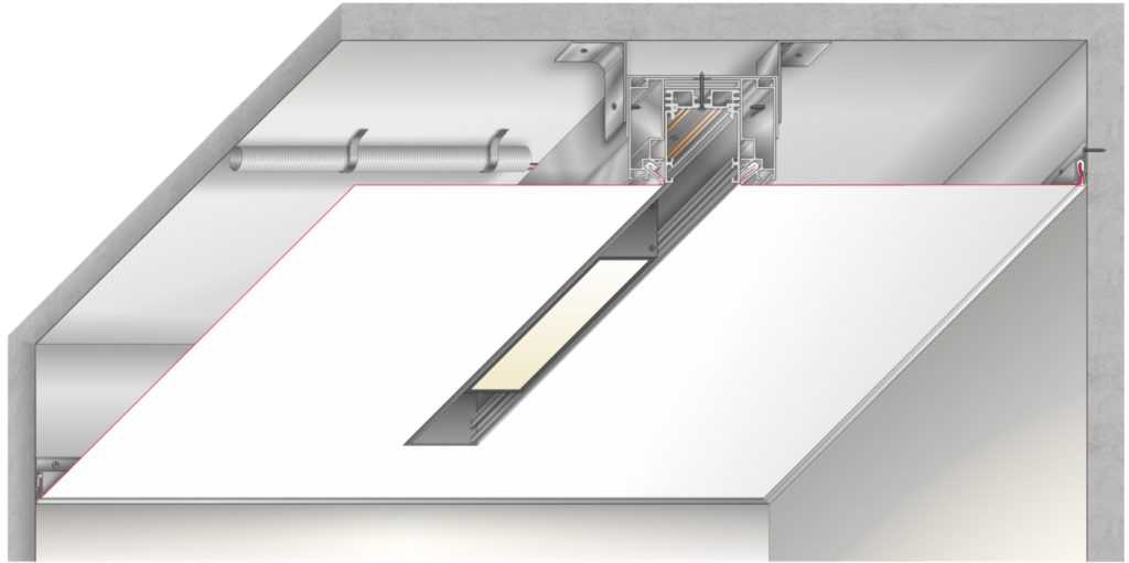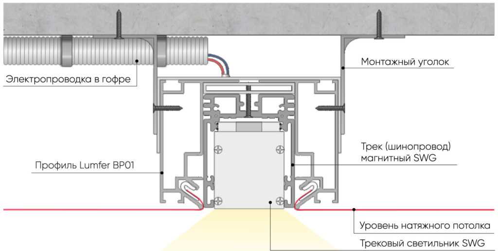Ниша для трекового светильника Lumfer собирается из двух профилей ВР01, соединенных скобой. Ниша целиком монтируется за натяжной потолок без заглушек и вставки. В нишу устанавливается магнитный трек со светильниками.