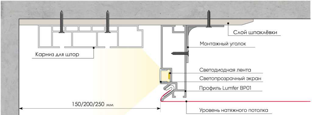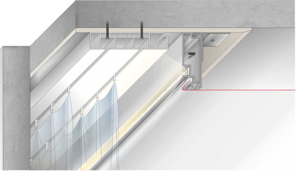 При помощи профиля Lumfer BP01 можно изготовить нишу под карниз с подсветкой и без нее. Ниша должна быть подготовлена- зашпаклевана или выкрашена в белый цвет. Профиль Lumfer BP01 устанавливается вертикально на заданном расстоянии от стены ( расстояние рассчитывается с учетом объема штор и отступа от радиаторов, ширины карниза). Подсветка устанавливается в паз профиля и закрывается специальным светопрозрачным рассеивателем. Полка ниши для штор не закрывается натяжным потолком. Возможно установить нишу для штор вдоль нескольких смежных стен, угол между которыми более 80 градусов.