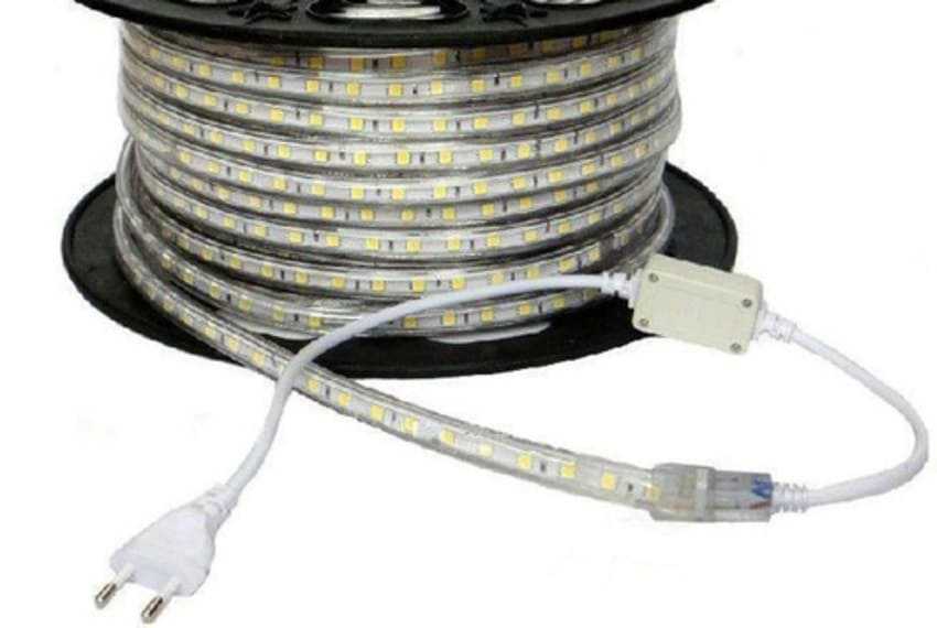 Первая конструктивная особенность таких источников света – минимальный шаг нарезки 1 метр. Она снижает ремонтопригодность подсветки. В случае проблем вырезать из готовой иллюминации 1 метр изделия будем затруднительно. Приходится перемычкой, замыкая по очереди диоды, определять сгоревший элемент. При закорачивании неисправного светодиода, остальные станут гореть. Переставлять перемычку для поиска приходится на ленте находящийся под напряжением 220 В, что может быть опасно.