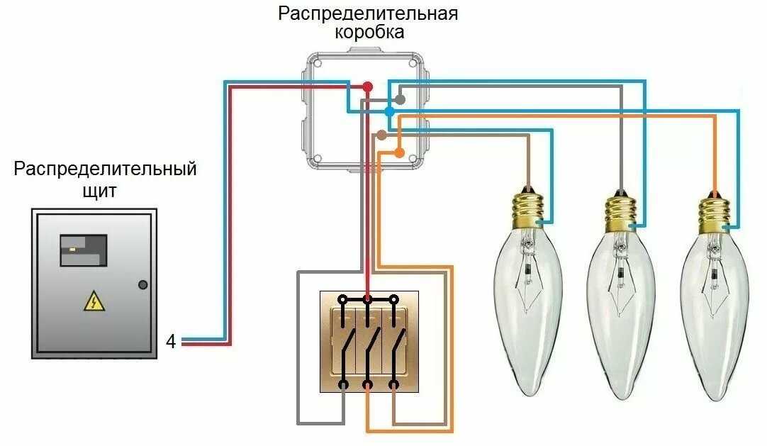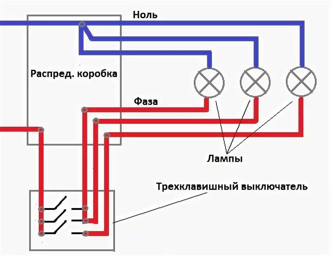 На показанной схеме нулевой провод через распределительную коробку разведен по всем лампам (через потолок или верхнюю горизонтальную штрабу), а фаза подводится к выключателю. После выключателя каждый из проводов подводит фазу к своей лампе, то есть делается три штрабы — на каждую лампу по одной. Это не всегда хорошо.