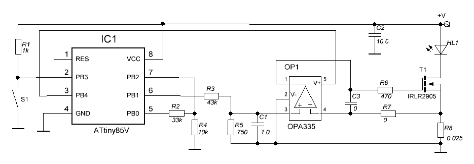 Один из вариантов такого устройства – когда блок управления выполнен на стандартном микроконтроллере (например, ATtiny85), в который зашита программа управления режимом излучателя, промежуточным усилителем служит операционный усилитель OPA335, а в качестве ключа используется полевой транзистор IRLR2905.
