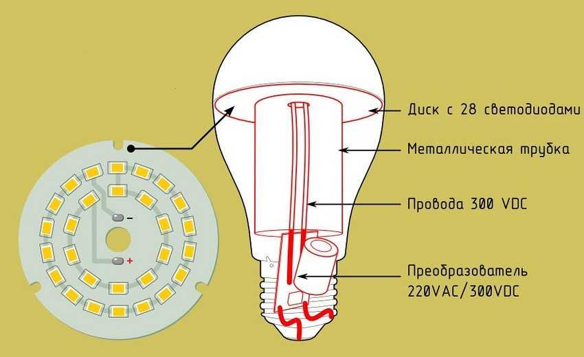 Конструкция данной лампочки состоит из следующих элементов: рассеивателя, светодиодов, монтажной платы, радиатора, блока питания, корпуса и цоколя. Последний элемент может иметь два типоразмера патрона: Е14 (маленький) и Е27 (большой).