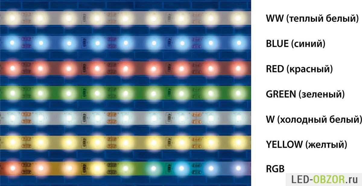 Светодиодная лента RGB имеет три кристалла (разноцветные светодиоды). Каждый светодиод отвечает за свой цвет: R-Red (красный), G-Green (зелёный), B-Blue (синий). В результате смешения этих базовых цветов получаются самые разнообразные оттенки, это значит, что светодиодные ленты RGB имеют широкий цветовой спектр.