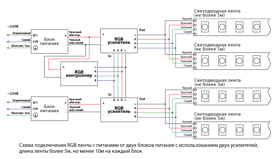Подключение двух и болееrgb лент возможно без усилителей в случае использования RGB-лент с несколькими десятками диодов на метр, однако потребуются блок питания и контроллер двойной мощности.