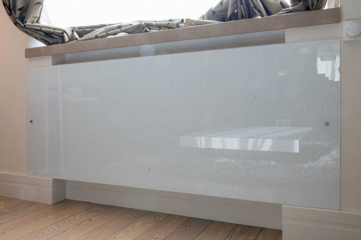 Экран, выполненный из стекла, станет интересным и стильным решением, особенно для тех, кто выбирает минимализм или современный стиль в дизайне интерьера. На стекло может быть нанесена фотопечать или различные узоры, но такой способ не является бюджетным вариантом. Монтаж производится на винтовой держатель, но в стене придется сверлить отверстия. Однако радиатор отопления будет стильно защищен. Такой вариант впишется в любой интерьер.