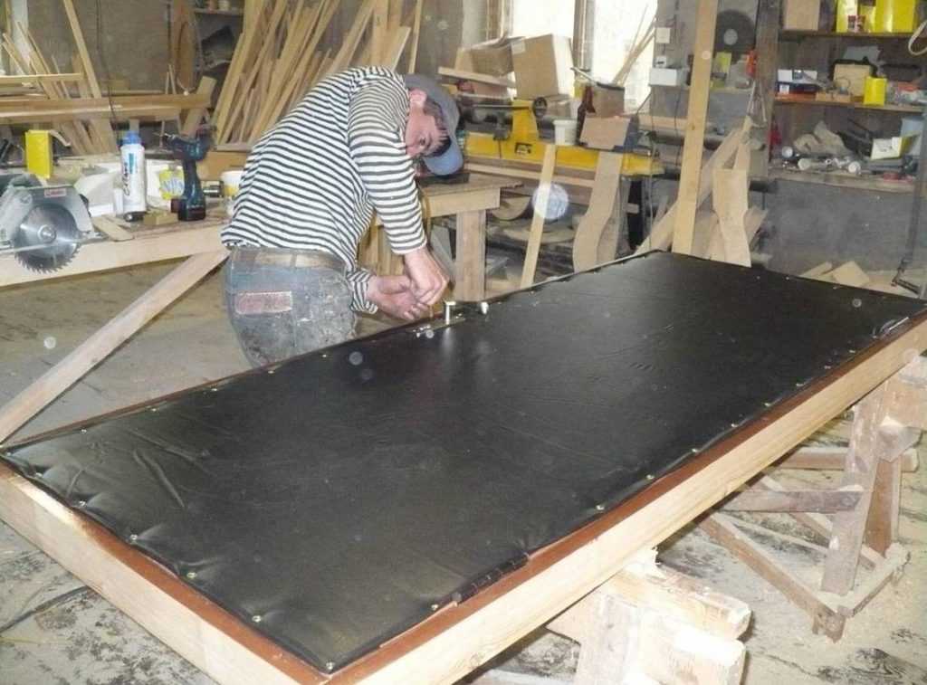 Выкраивают прямоугольник из мягкого материала с размерами на 10 мм меньше, чем полотно, прочно закрепляют. Сверху накладывают отделочный дерматин, расправляют, прибивают декоративными гвоздями.
