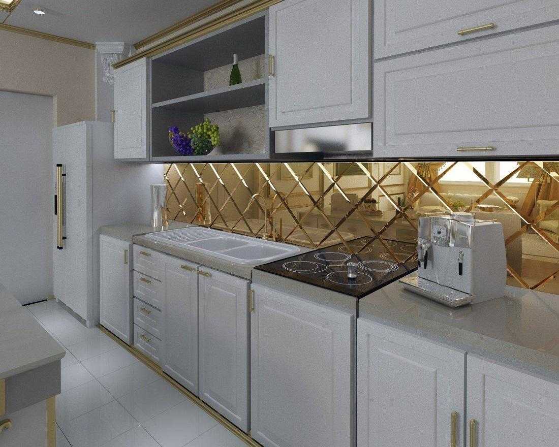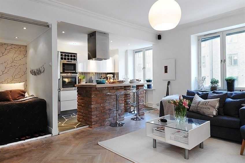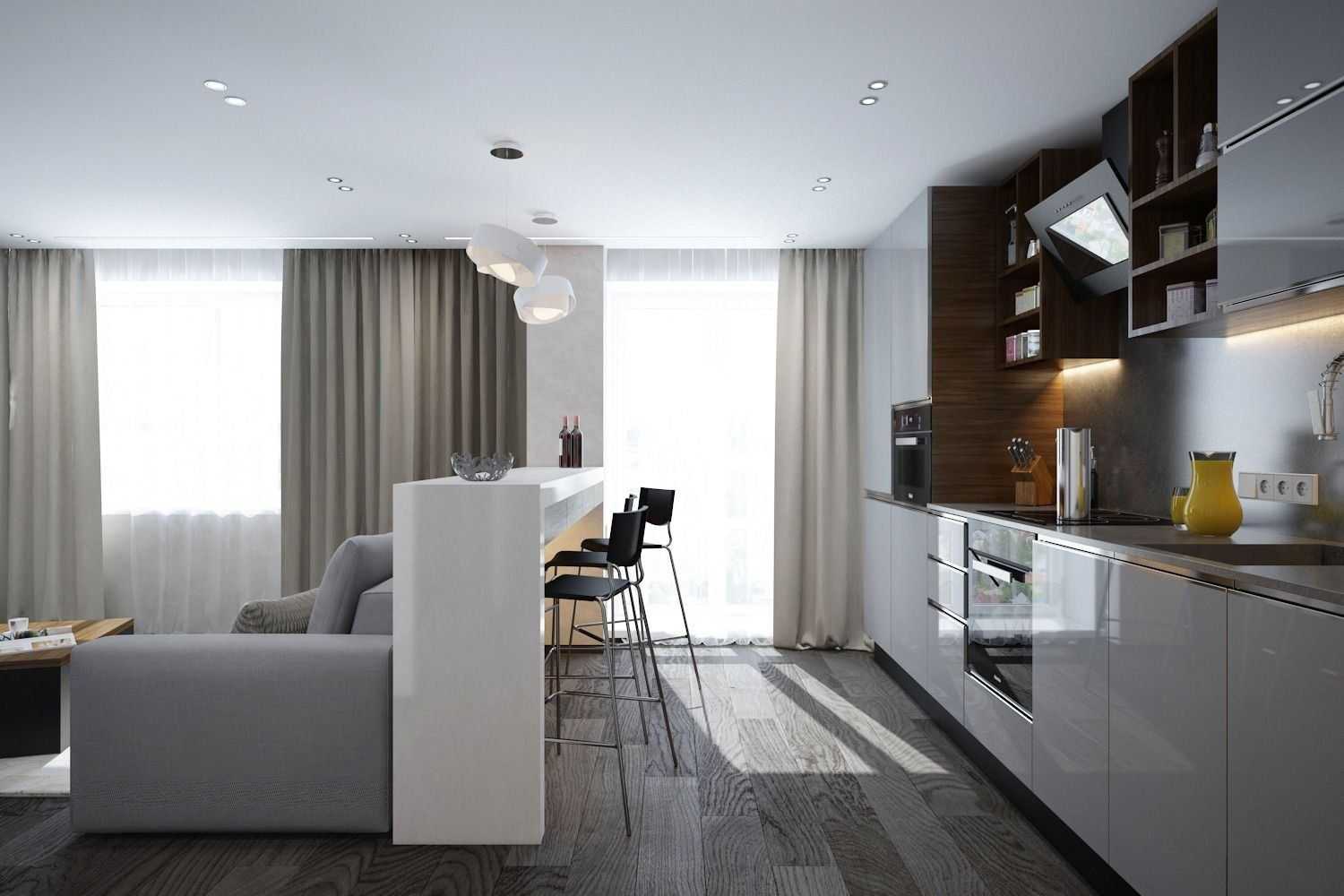 - желательно размещать кухонную зону в нишах и возводить невысокую стационарную перегородку или барную стойку. На перегородку, со стороны гостиной, можно навесить телевизор, а поверхность, выходящую на кухню, облицевать стеклом.