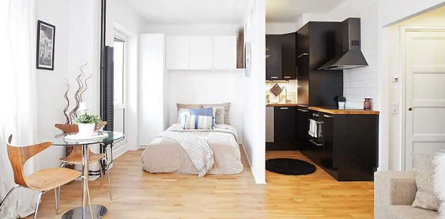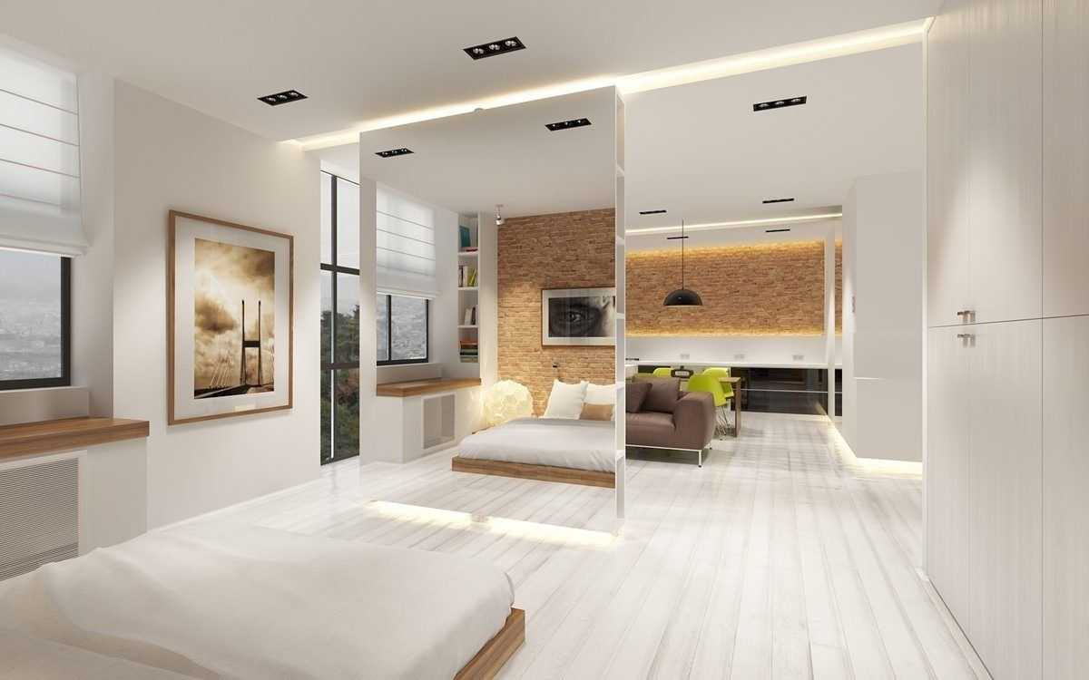 Одним из самых популярных планировочных решений, считается разграничение студии на спальную зону и гостевую с кухней, столовой, гардеробом и санузлом. Для отделения места для сна, в основном используют специальные перегородки, ширмы или арки.
