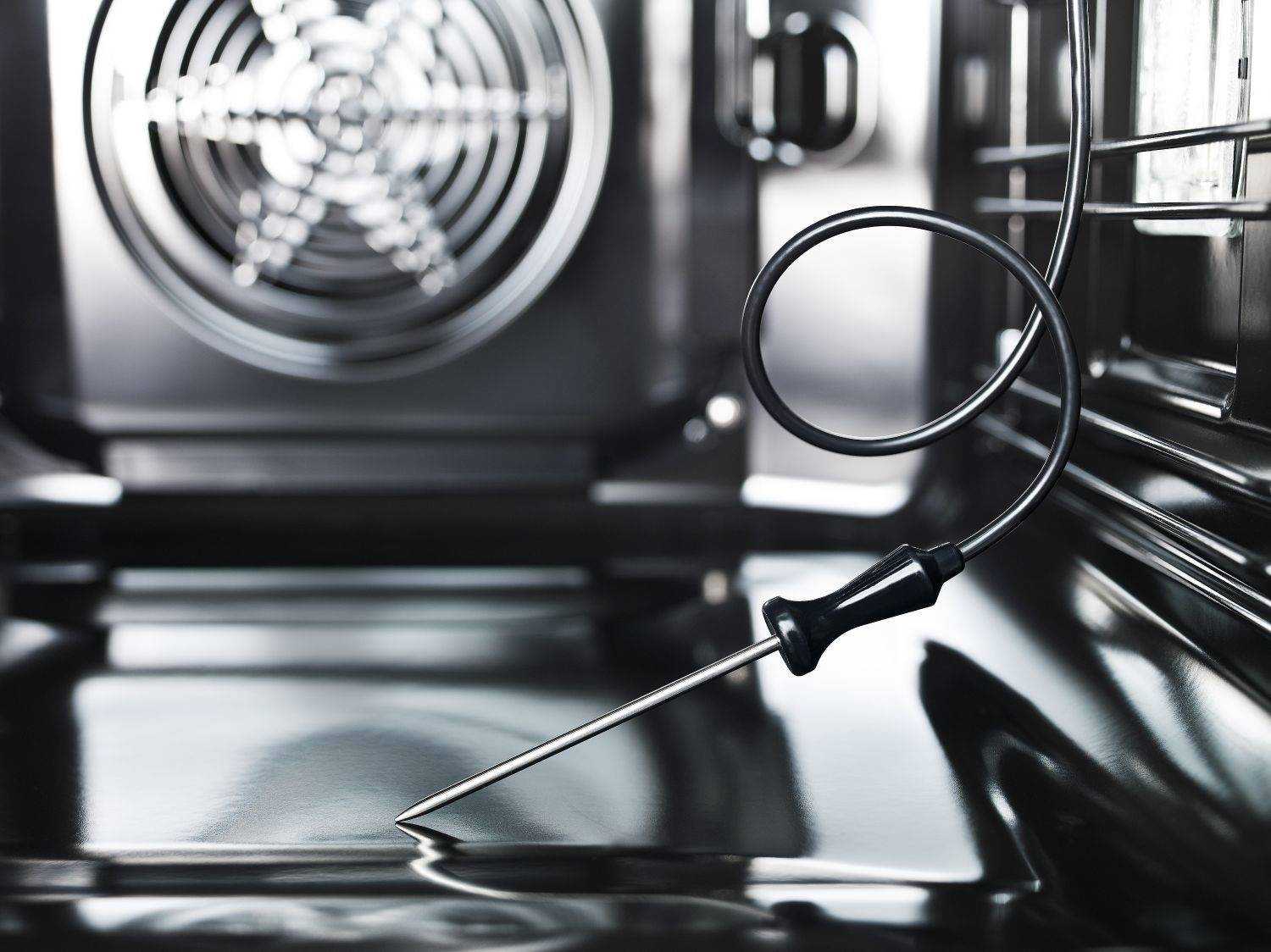 При запекании больших кусков мяса бывает трудно оценить, насколько температура внутри куска отличается от температуры воздуха в рабочей камере, а следовательно, и сделать предположение о степени готовности продукта. Вам на помощь придет термощуп – термометр, измеряющий температуру внутри приготавливаемого продукта. Когда необходимая температура будет достигнута, термощуп «сообщит» об этом системе управления, а та в свою очередь оповестит об этом пользователя или произведет автоотключение.