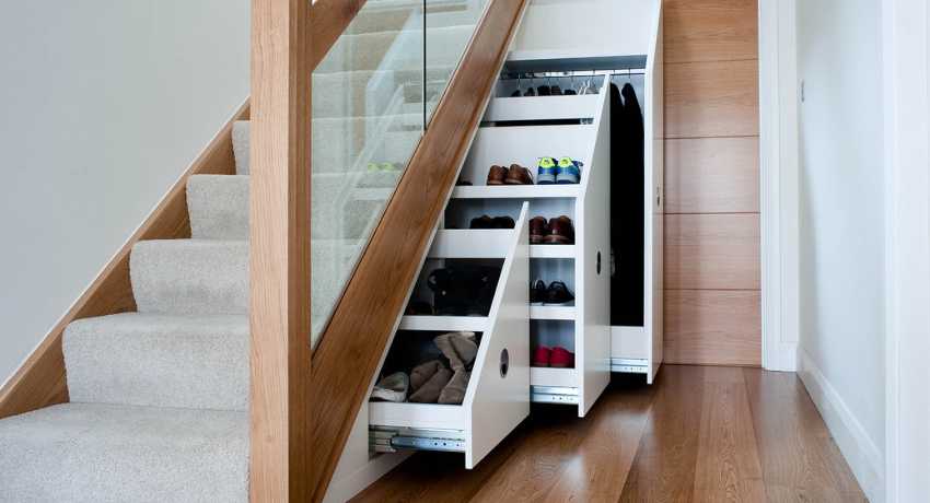 Шкафы внутри В случае, когда у лестницы не «глухие» ступени или же они склонны пропускать пыль, то более практично воспользоваться вторым вариантом, т.е. использовать нишу для установки мебели для одежды.