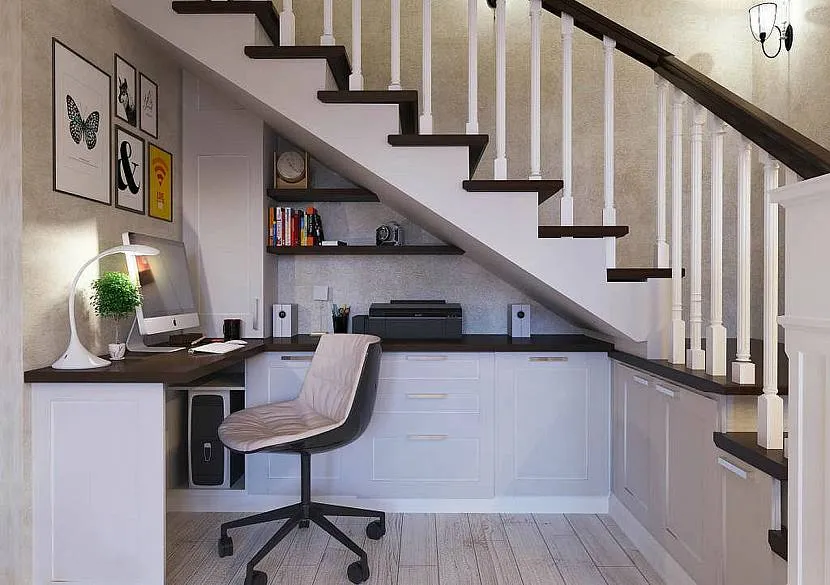 Уединенное пространство под лестницей можно переоборудовать в компактную рабочую зону. В качестве стола подойдет как классическая модель, так и конструкция с выдвижной столешницей. Угловой предмет интерьера отлично поместится на участке, меньше 2 квадратов. Для работы компьютера, оргтехники и светильников проводят электричество. Скошенную область под маршем используют под полки, внизу устанавливают тумбы.