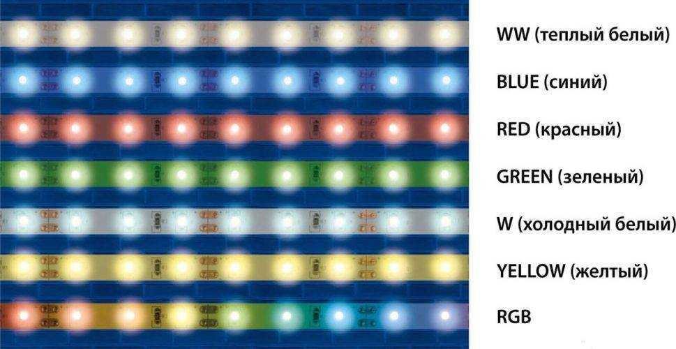 Цвет диодов, установленных в ленте, может быть синим, красным, зелёным, жёлтым, тёплым и холодным белым, а также в виде RGB-ленты. Белые диоды имеют синий цвет, на который нанесён слой специального люминофора. В процессе выгорания свечение делается более тусклым, с характерным синеватым оттенком.