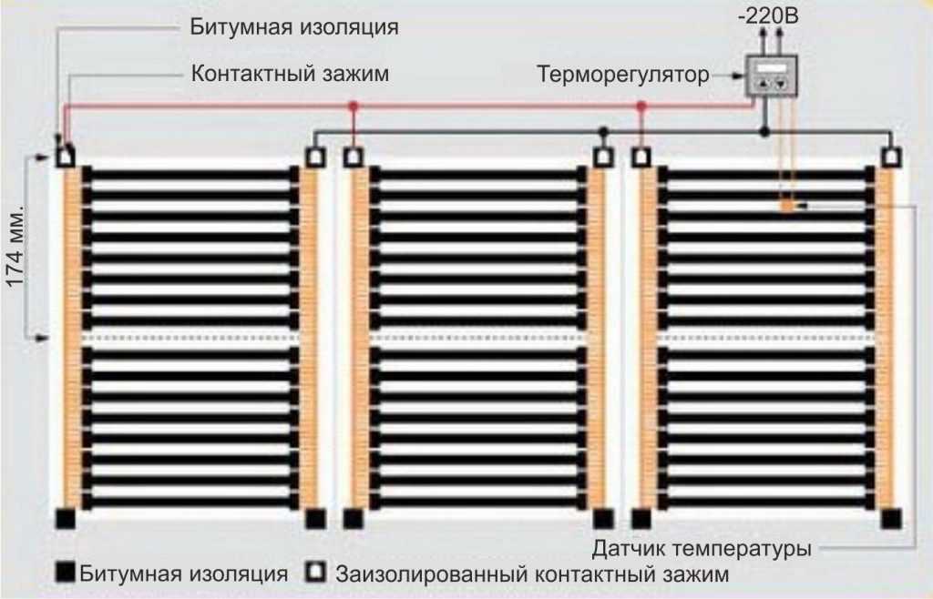 Нагревающую пленку потом надо разложить вниз с медной полосой, соединяют детали по схеме параллельно. При выходе из строя одного из элементов остальные будут функционировать.