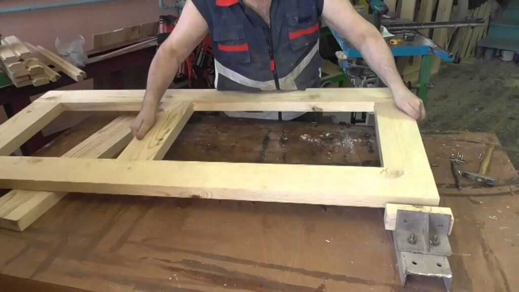 - Собирают внешнюю обвязку — каркас полотна. Для этого боковые брусья соединяют с перемычками — верхней нижней, центральной. Для создания жёсткой конструкции используют соединения шип в паз или делают выборки в половину толщины брусковых деталей.