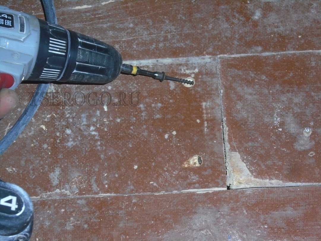- Возьмите дрель, замените сверло. Включите ее в розетку и просверлите в полу дыры. Сделайте отверстия только в тех местах, где пол начинает скрипеть.