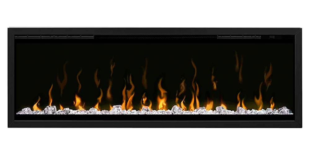 И начну я с Dimplex Ignite 50. Модель из серии линейных электрокаминов премиум-класса. Сочетает красивый вид и качественный обогрев помещения. Стекло по всей ширине камина обеспечивает безупречный панорамный вид, придаёт изюминку любому интерьеру. Модель настенного типа высотой 39,6 см обладает довольно большой шириной – 127,7 см, но маленькой глубиной – 14,7 см. Её легко встраивать в стенку за счёт узкого профиля, можно использовать порталы разного цвета и дизайна. Очаг поставляется с прозрачными акриловыми кристаллами, которые имеют 8 видов оттенков подсветки. Алмазоподобные кристаллы создают эффект переливающейся поверхности, от которой красиво отражается свет. Для реалистичной имитации огня использована технология пламени Multi-FireXD. Дополнительно можно приобрести другие аксессуары для придания эстетики интерьеру – декоративную гальку, поленья с эффектом тления. Мощность модели — 2 кВт.