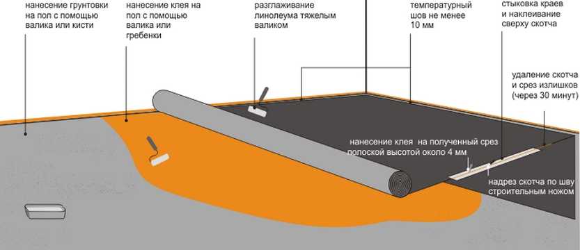 - укладку линолеума без клеящей основы (технология для монтажа натурального покрытия) или укладку покрытия с помощью мастики или клея.