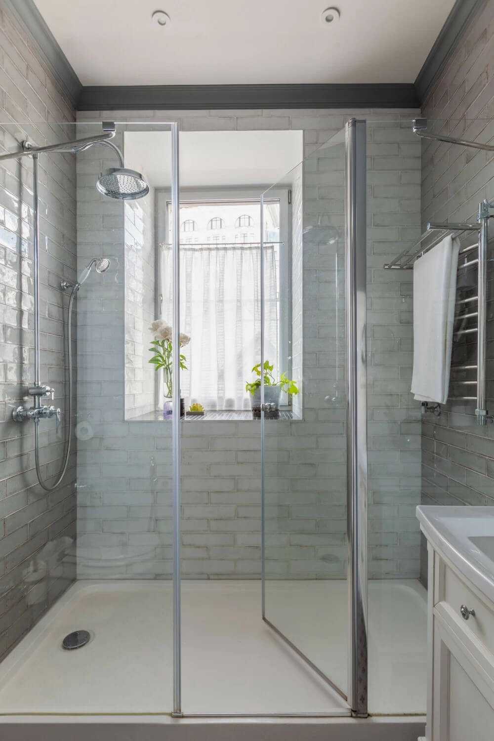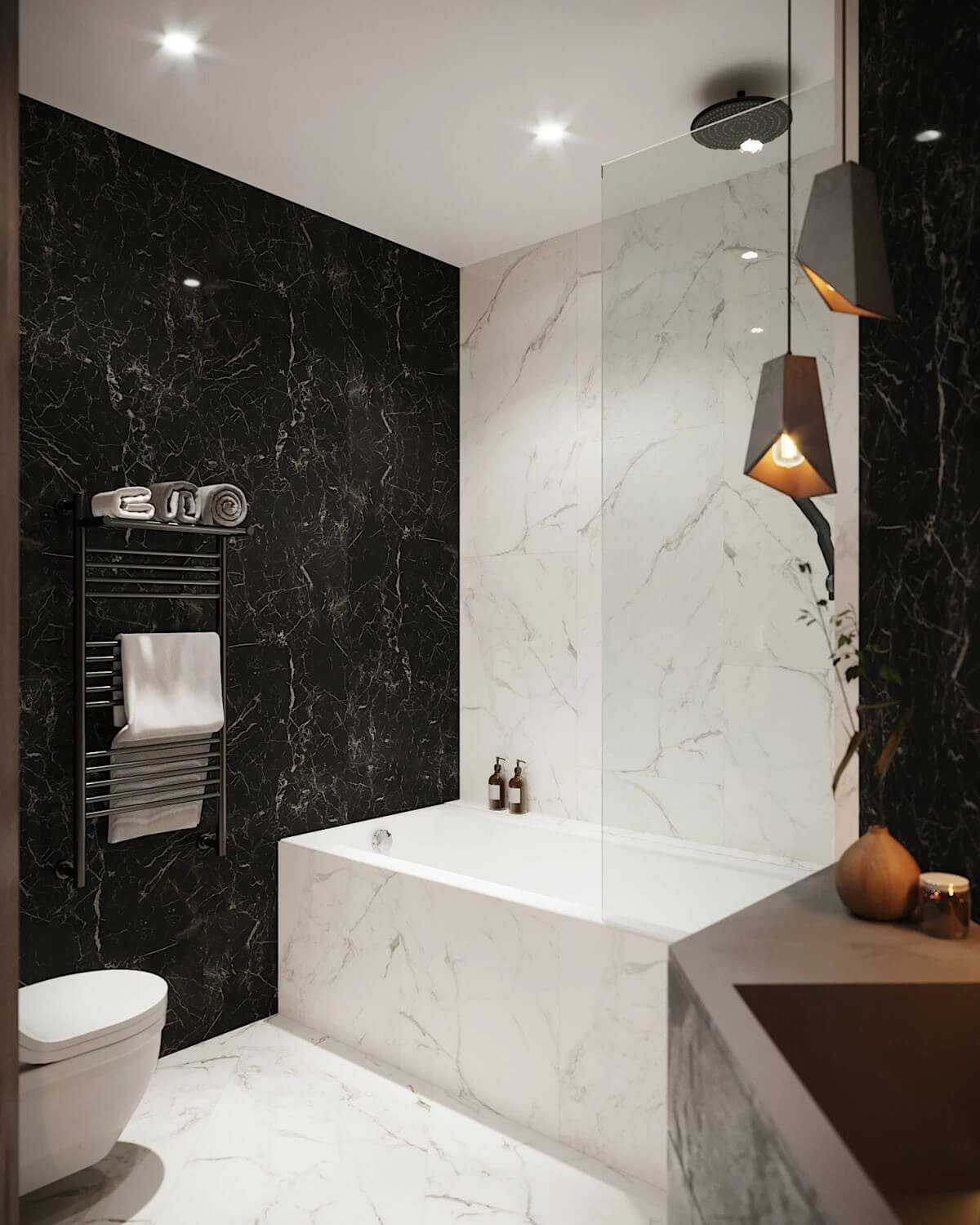 Если в устройстве предусмотрена полка, появится дополнительное место для хранения полотенец, которые всегда будут не только сухими, но и приятно тёплыми. Проект апартаментов площадью 93 м², дизайнер Николай Николаев
