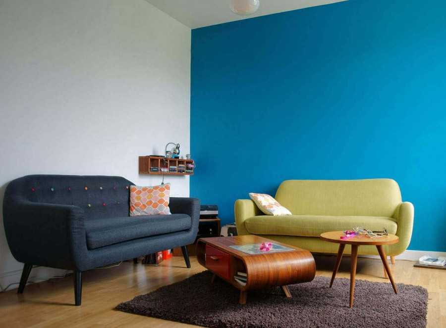 Универсальной для гостиной является акриловая краска на водной основе. Однако в этом помещении подойдет практически любая краска на водной основе, особенно если поверхность, на которую наносится краска, это штукатурка, обои или бетон.