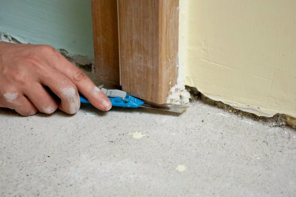 - подрезать дверные косяки по высоте стяжки.