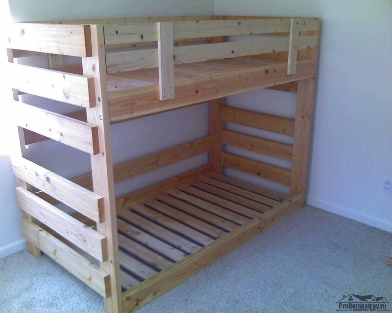 По описанному выше принципу создают отдельно 2 конструкции (односпальные для детей или взрослых). Они будут находиться друг над другом. Стенки изготавливают из соединённых между собой паллетов – их крепят металлическими пластинами. С внешней стороны конструкции прибивают доски небольшого сечения (создаётся выступ П-образной формы), он не позволит упасть во сне на пол. Верхний каркас должен устанавливаться на боковые стенки.