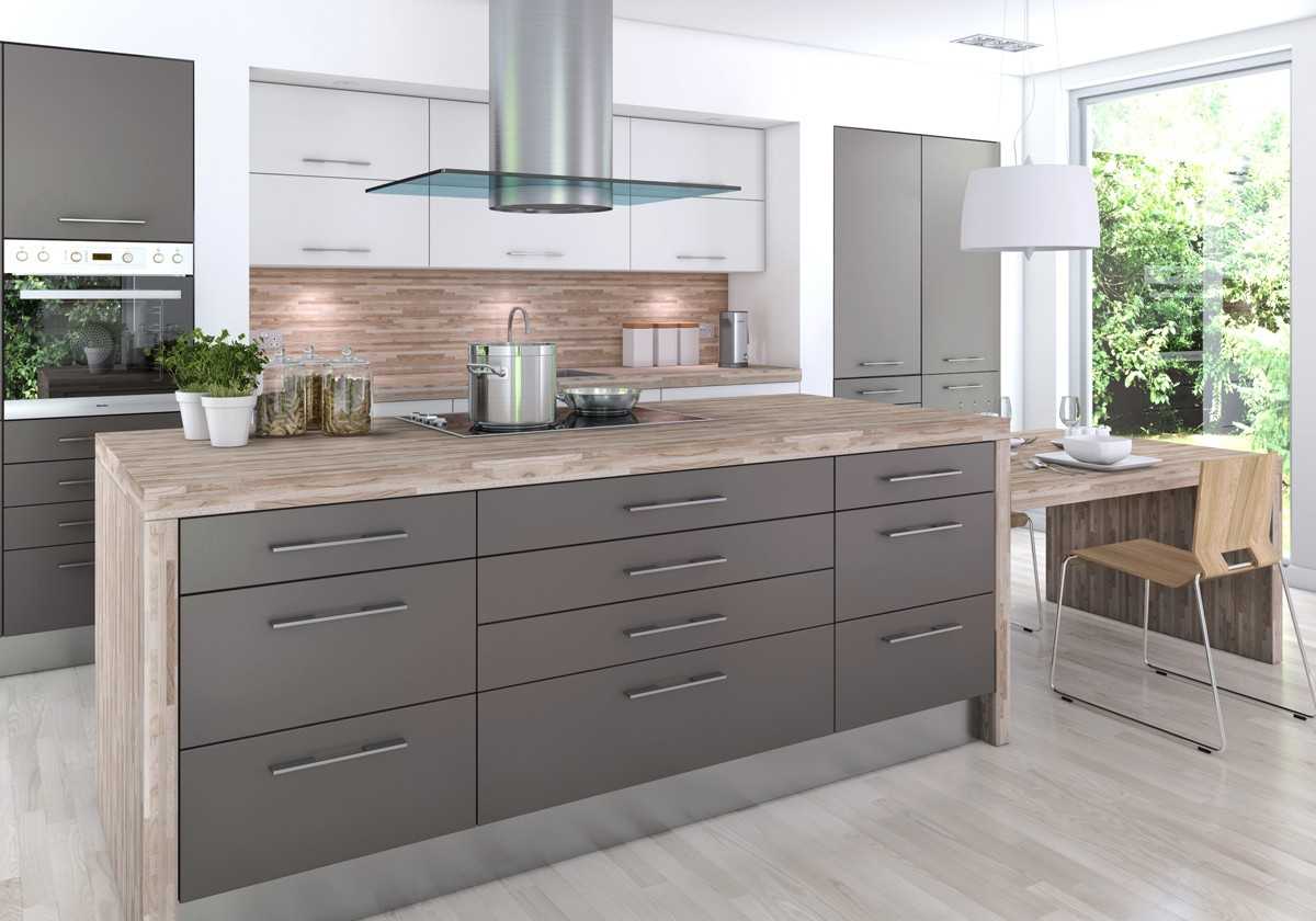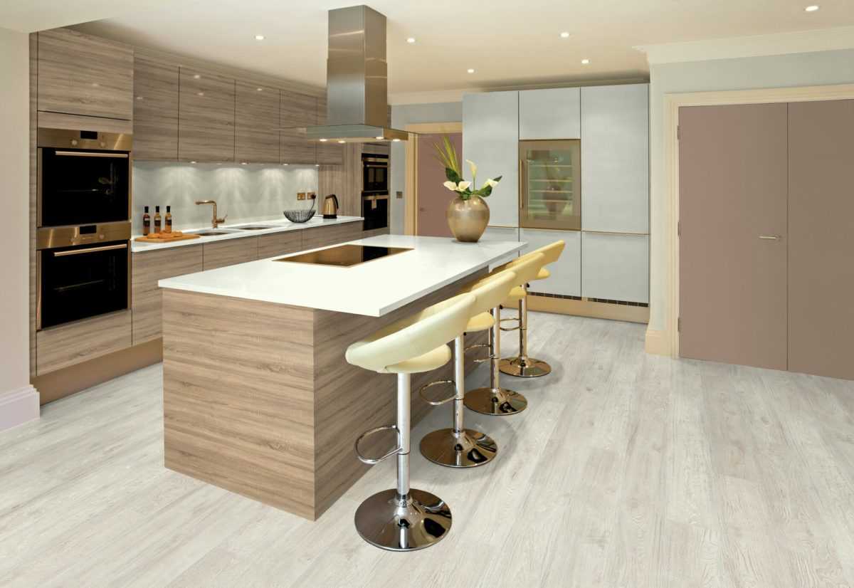 Нейтральный цвет выбирается в тон нижней части кухонных фасадов. При сочетании цвета пола с мебелью должны учитываться габариты помещения.