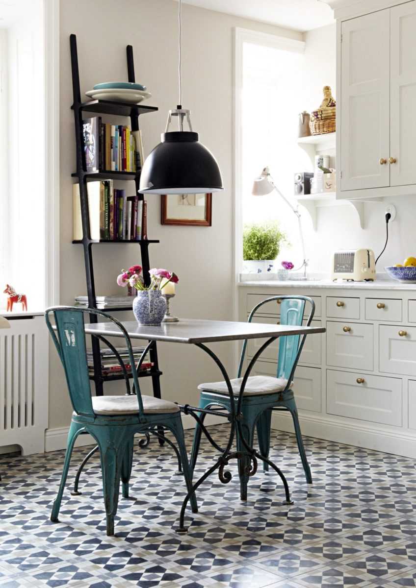 - В помещении, стилизованном под ретро обстановку, можно скомбинировать мелкоформатную плитку (рабочее место) и ковролин (столовая).