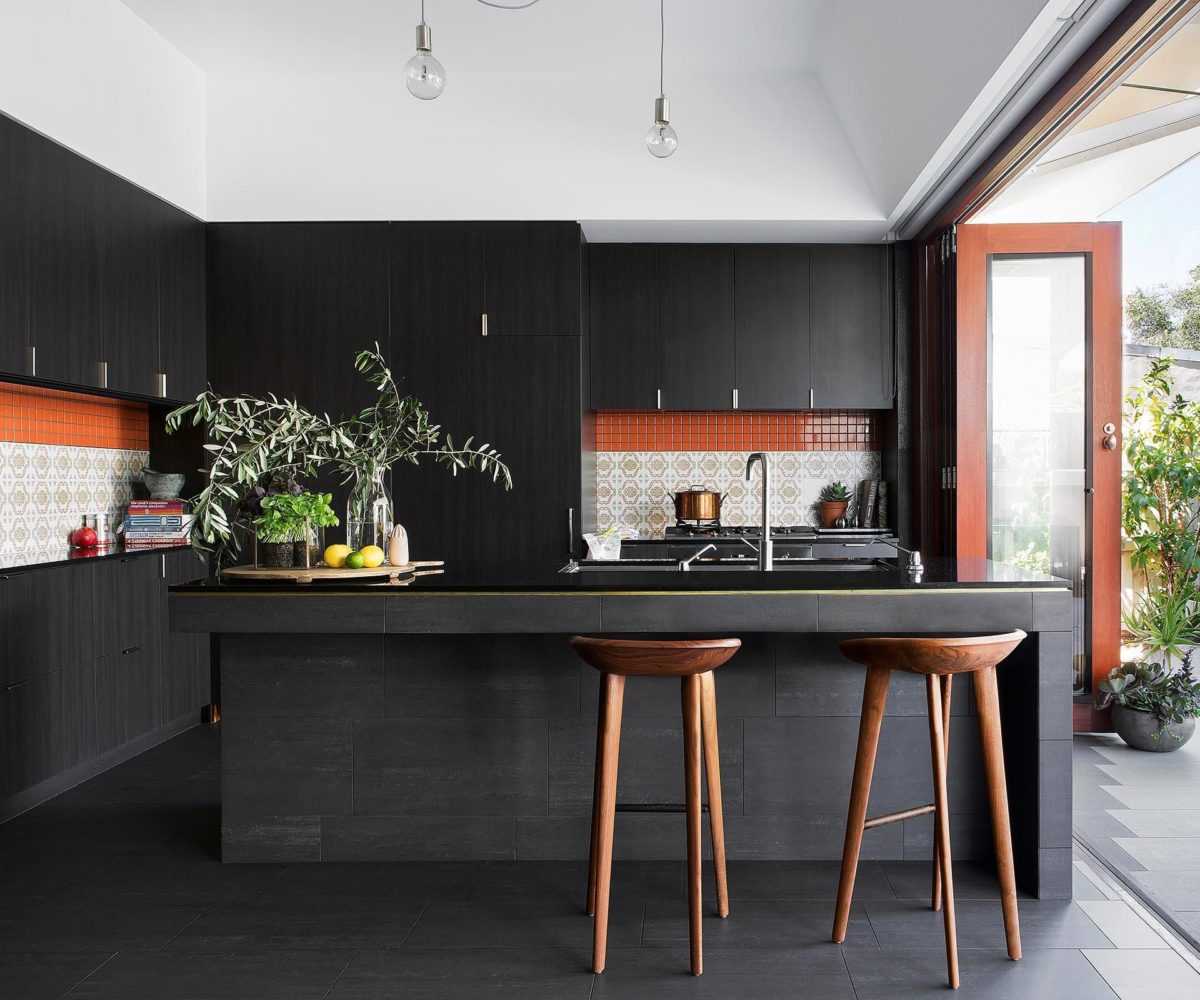 При выборе контрастного сочетания важно, чтобы пол и верхние фасады совпадали по тону. Если фартук и столешница выделяются на фоне мебели, то пол рекомендуется делать в их цветовом решении или отталкиваться от оттенков фартука