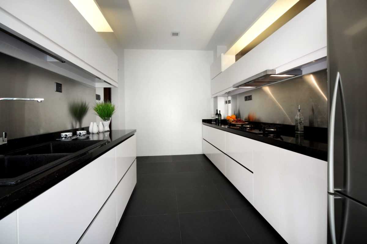 Данное решение является самым распространённым в кухонном дизайне. Контраст в первую очередь подчёркивает выразительность кухонного гарнитура. Например, светлая мебель будет выгоднее смотреться на тёмном полу и наоборот.