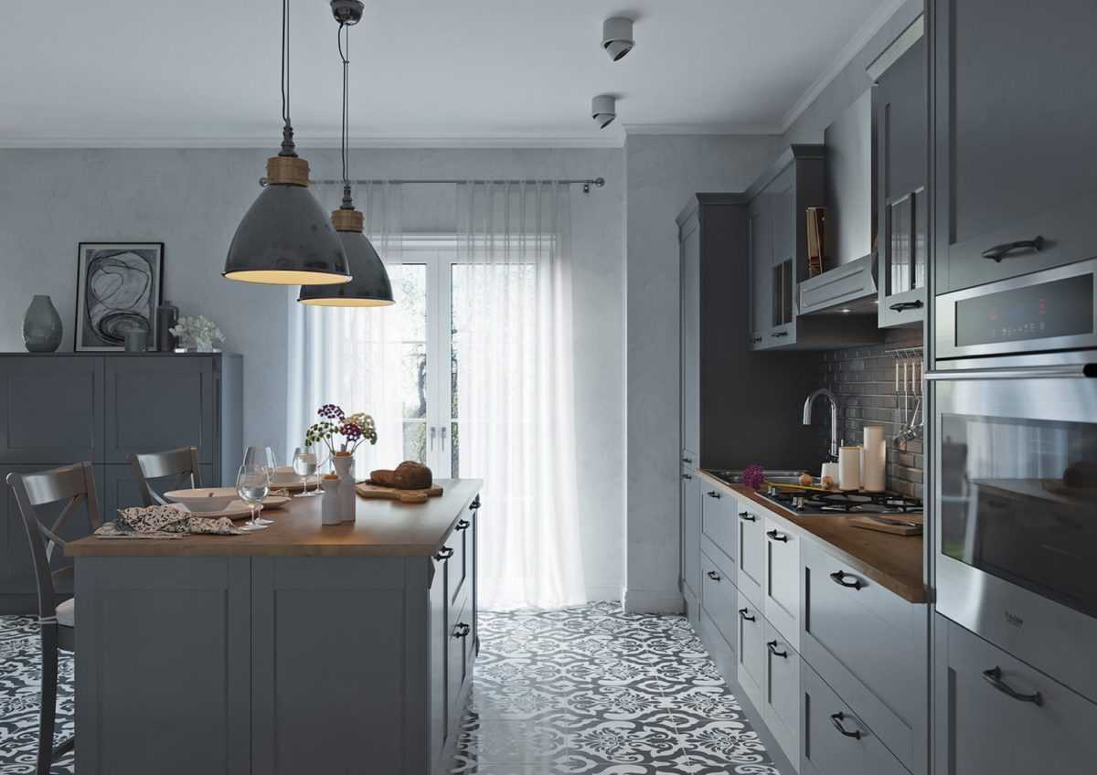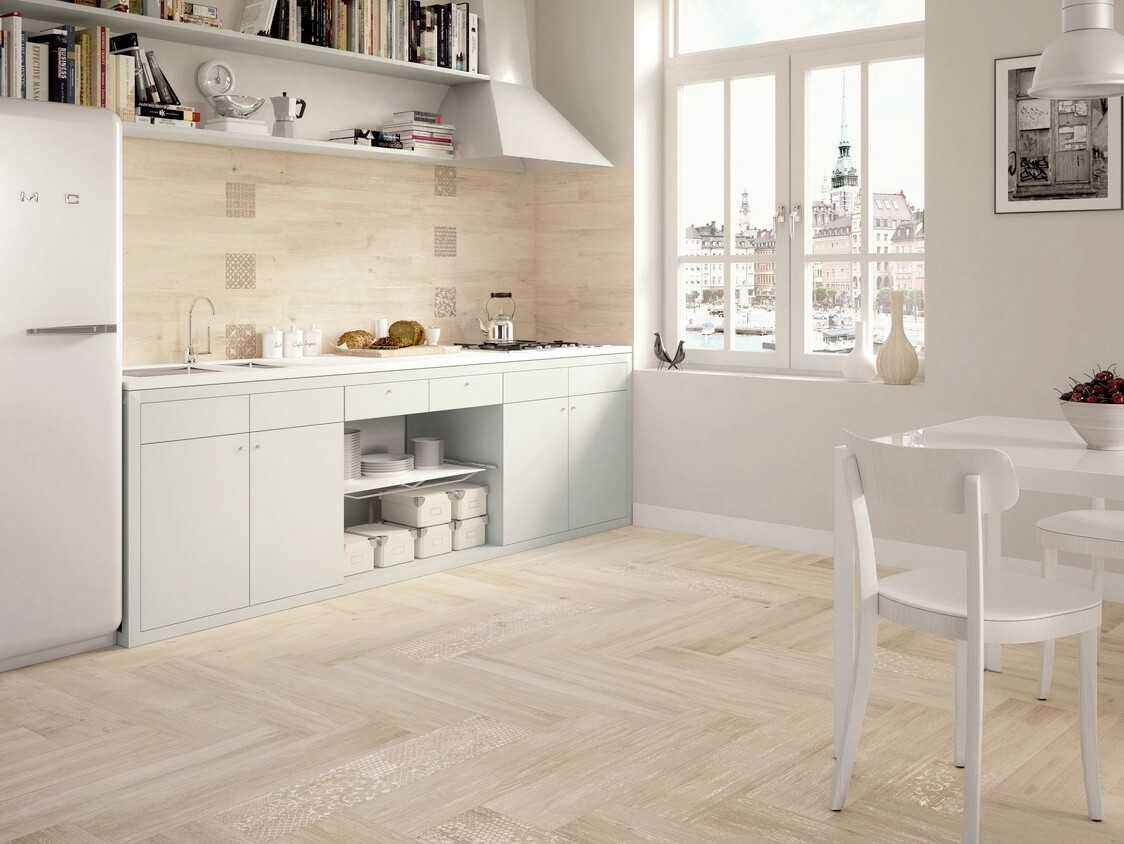 Такой вариант идеален для нейтральной кухни. В этом случае пол выкладывается с явно выраженным рисунком или принтом. Пол становится главным элементом кухни. Он задаёт тон, создаёт декор и атмосферу всего помещения.
