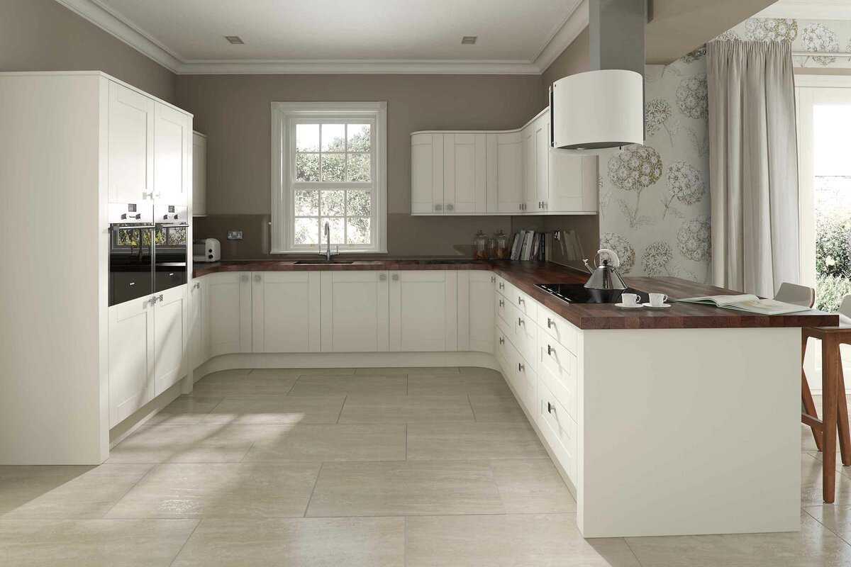 Если гарнитур, столешница и фартук выполнены в нейтральном цвете, то пол должен совпадать с каким-нибудь другим элементом интерьера (дверью, оконными рамами).