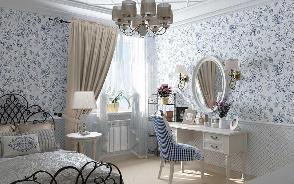 Обои с мелкими цветами в интерьере спальни в стиле прованс.