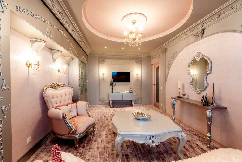 Централизованный свет. Традиционно для гостиной подбирается большая люстра, которая располагается в середине комнаты.