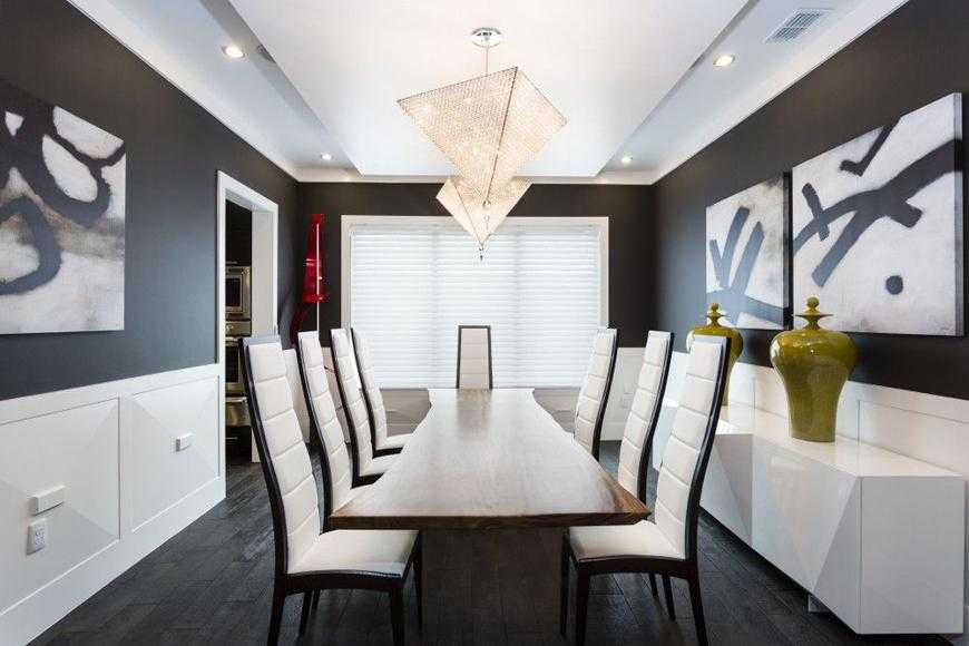 Чтобы украсить обеденную зону, добавьте несколько подвесных потолочных светильников, которые дополнят интерьер кухни. Отлично подойдет хрустальная люстра или модель со стеклянным абажуром. Если вам хочется чего-то более деревенского, попробуйте лампы с абажурами из дерева или ткани – все, что не испортится от пыли и жира. Поместите одну лампу над столом, или несколько приборов в линию, или любую другую форму, которая вам нравится.