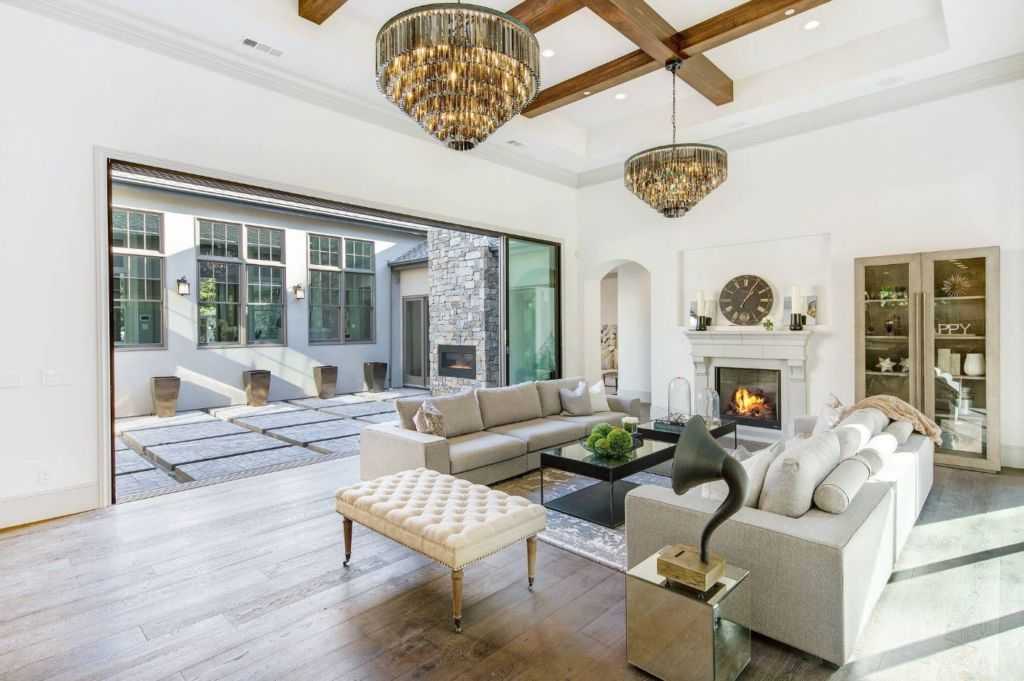 Продумать расположение светильников и проложить проводку нужно ещё до установления напольного покрытия. Но усилия не будут напрасны: декоративный эффект такого современного освещения гостиной будет потрясающим.