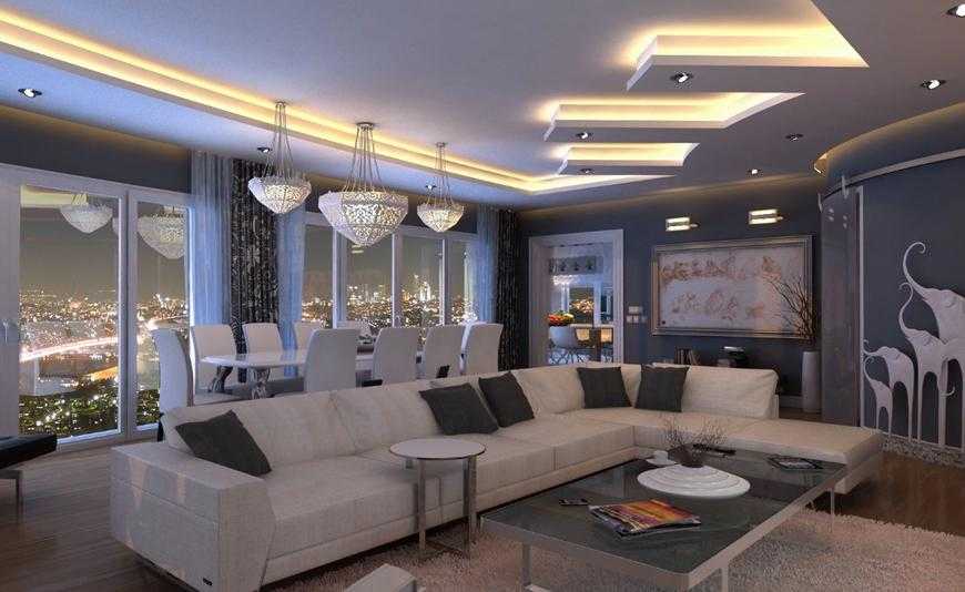 Закарнизная подсветка. Освещение потолка в гостиной станет свежим решением в оформлении комнаты, особенно если в нём несколько уровней.
