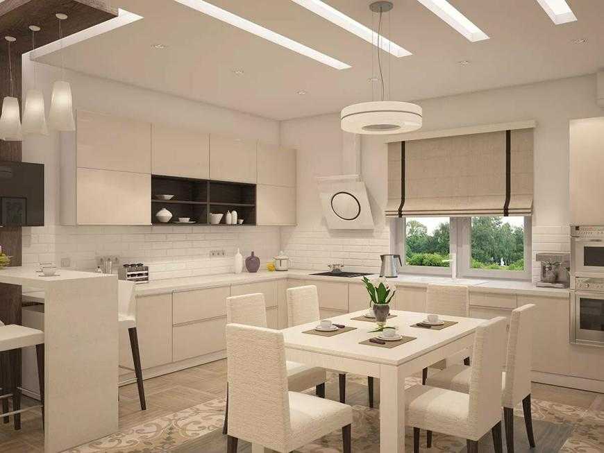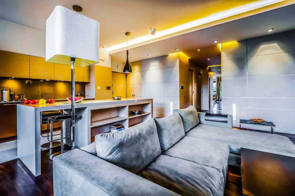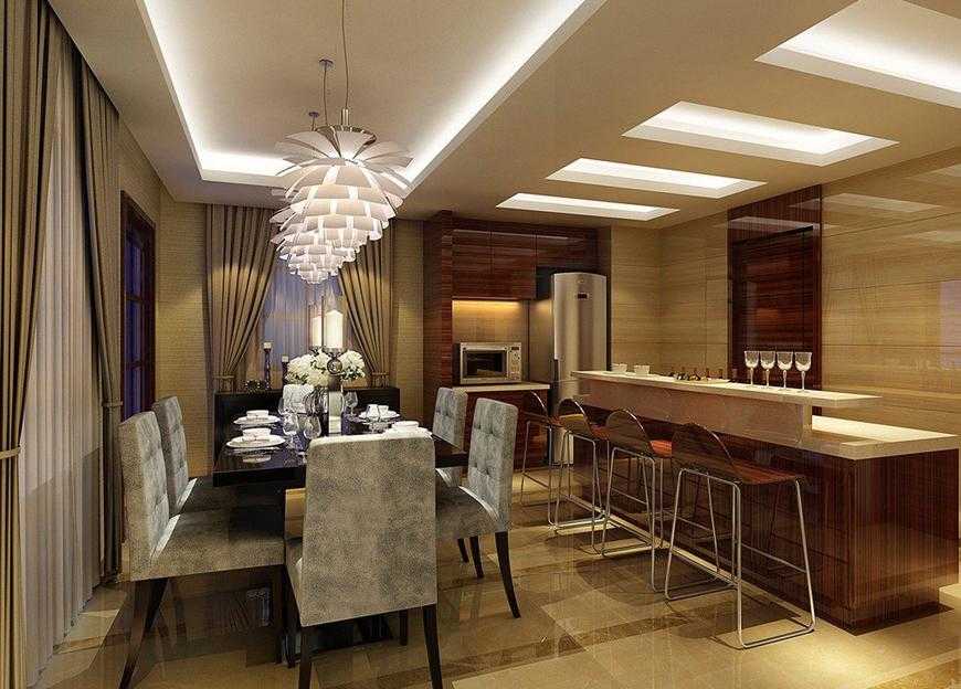 Стало популярным совмещать одновременно кухню и зал вместе, чтобы площадь казалась немного больше. Чаще всего такая планировка предусматривается в квартирах-студиях. Для маленькой гостиной можно создать зонирование между кухней и залом. Массивный светильник, размещенный выше кухонного стола, идеально смотрится. Для общего освещения можно использовать люстру по центру комнаты или точечные споты по периметру.