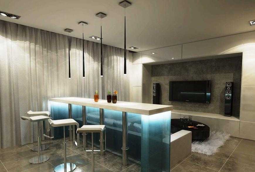 Трековое освещение зоны приёма пищи — барной стойки. Проект кухни-гостиной для квартиры в ЖК «Грин парк», дизайнер Павел Алексеев