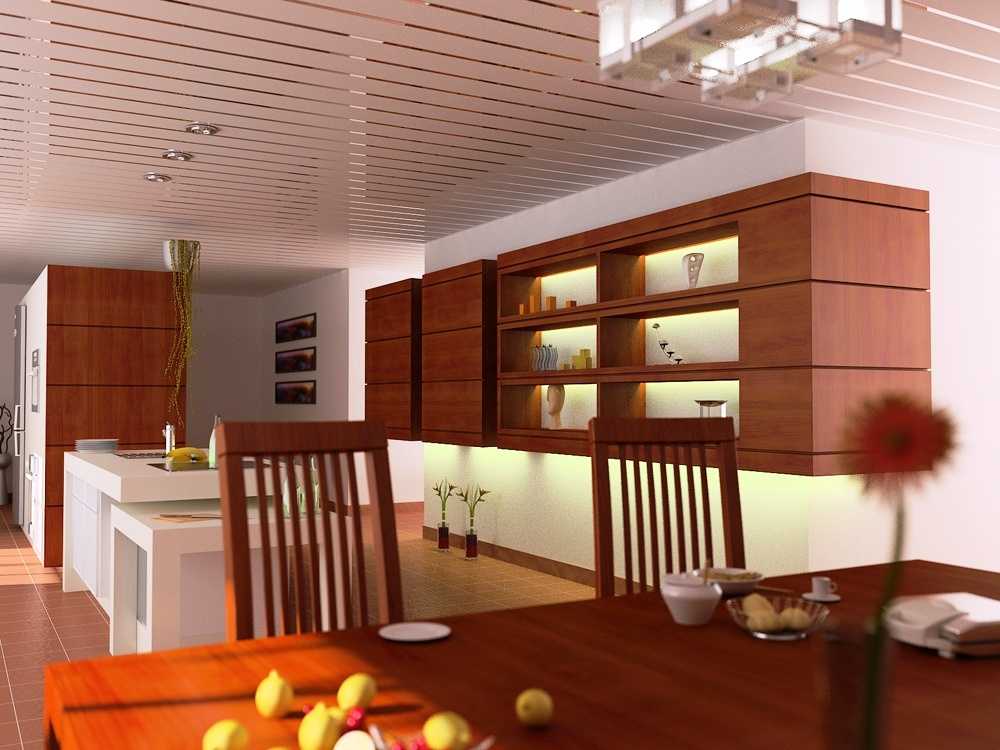 Такой вид отделки подойдет далеко не для каждого интерьера. Во-первых, кухня с деревянным потолком требует площади большого размера, особенно, если вами задумана отделка деревом темного цвета. Во-вторых, потолок из дерева должен иметь соответствующую интерьерную обстановку.