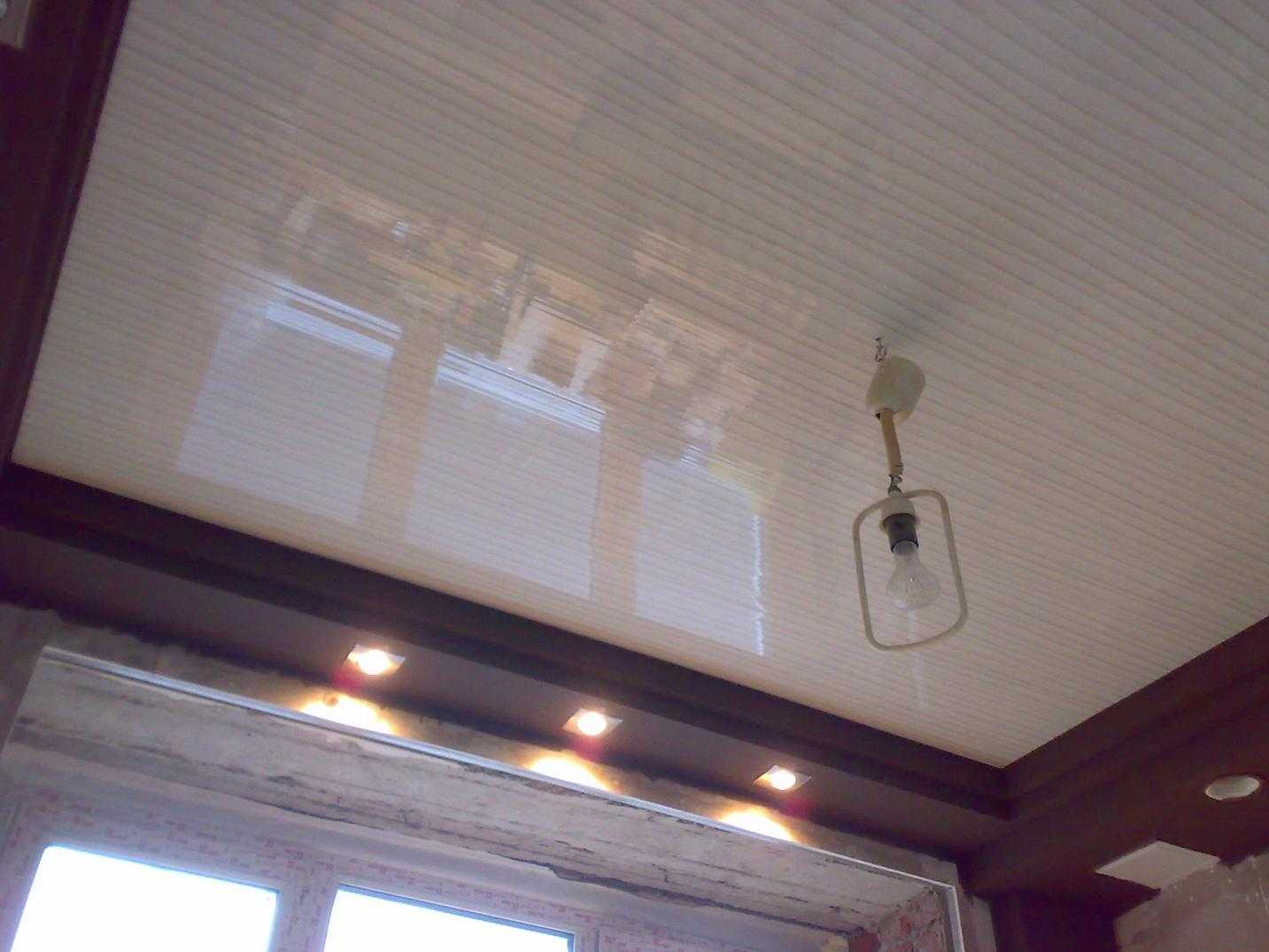 Отделка потолка ламинатом может вызвать на первый взгляд удивление, но влагостойкий ламинат вполне применим не только на полу, но и на потолке кухни. Установка производится подшивным способом, что значительно сохраняет высоту помещения.