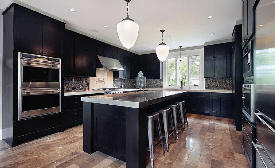 Не редкость для кухонных зон – потолки двухуровневые. На такой конструкции обычно располагают множество осветительных приборов – за счёт этого комната может быть поделена на обеденную зону и рабочую (очень интересный приём).